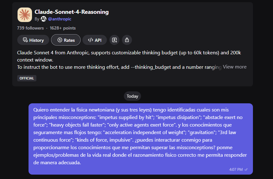 Pero como el force concept inventory también te indica cuales son las “missconceptions” en función de las respuestas que das, se me ha ocurrido jugar con Claude4-sonnet-reasoning. Con este esté sencillo promtpt que aparece en la imagen me ha dado para estar unos 40 minutos respondiendo a las preguntas que me hacía la plataforma.