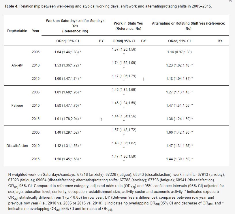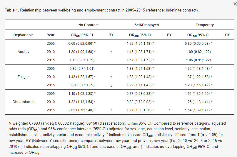 Asi, por ejemplo, en la tabla 1, que compara tipos de contratos, las personas sin contrato, en el año 2015, tenían el doble de probabilidad de experimentar insatisfacción que las que tenían contrato indefinido. O, en la tabla 2, las personas que ocupaban puestos de supervisión, en el año 2015 tenían más probabilidad de sufrir ansiedad que las que personas que no supervisan el trabajo de otras (un valor 1,38 veces la probabilidad de las que no supervisaban). Curiosamente en el año 2005, la probabilidad para ese grupo era el 0,87 (es decir, menor) de la probabilidad de ansiedad en las que no supervisaban. Supervisar a otras personas generaba menos ansiedad en 2005 que en 2015, también generaba menos fatiga en 2005, mientras que en 2015 generaba más fatiga. Sin embargo supervisar a otras personas parece ser un factor protector contra la insatisfacción (están menos insatisfechos los que supervisan a otras personas) y se ha mantenido en los mismos niveles durante la serie de años estudiados.
