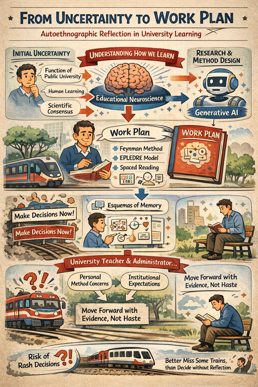 This communication presents an autoethnographic reflection. Building on four fundamental premises about the function of Spanish public universities and the established mechanisms of human learning, the author documents his personal journey from initial uncertainty to the design of a systematic work plan. The study focuses on understanding the current scientific consensus on how learning is consolidated in the brain and exploring the possibilities of generative AI to enhance this process in the university context. Drawing on the work of Héctor Ruiz Martín, a work plan is designed that combines recommendations from educational neuroscience with the Feynman method and the EPLEDRE model, including spaced reading, creation of sketchnote-type graphic schemes from memory, and public communication of the knowledge constructed. The communication shares the first graphic schemes developed and reflects on the author’s dual position as university teacher and administrator, facing both his own methodological uncertainties and institutional expectations for strategic guidance. It questions the “collective panic” surrounding the emergence of generative AI in universities and the pressure to make quick decisions without sufficient reflection. It proposes replacing reactive urgency with a deliberate process of calm, evidence-based reflection and pilot experimentation, recognizing that in contexts of accelerated change, it is preferable to miss some “trains” rather than make biased decisions under collective amygdala hijacking